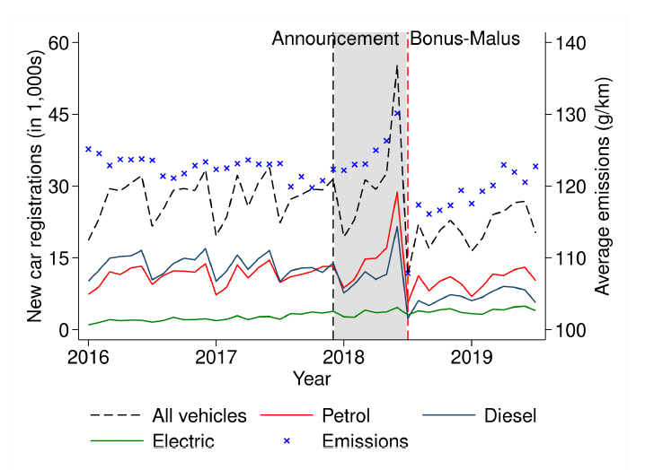 We study anticipatory behavior in response to Sweden’s vehicle feebate policy, a reform announced seven months prior to implementation that subsidizes low-emission vehicles while imposing higher road taxes on high-emission vehicles. Using administrative data on vehicle registrations linked to individual and firm characteristics, we document that the early policy announcement caused anticipatory vehicle adoption, largely reflecting intertemporal substitution but also generating modest excess purchases. To avoid the forthcoming higher road taxes, households and firms systematically brought forward the adoption of more emissions-intensive vehicles, resulting in a dirtier composition of the vehicle fleet ahead of implementation. Anticipatory adoption is most pronounced among those for whom acting early is easiest or adapting to the policy is most costly. Dealer stock-management strategies, household and firm liquidity, and information salience amplify anticipatory purchases, while access to charging infrastructure mitigates them by lowering the cost of switching to cleaner vehicles. We develop an empirical framework to quantify the environmental implications of anticipatory behavior, accounting for excess adoption, the higher emissions intensity of pre-implementation purchases as well as the benefits from the accelerated fleet turnover, and estimate total environmental costs of approximately $28.39 million — around 21 percent of the policy’s 2019 budget and 19 percent of its lifetime environmental benefits in 2019.